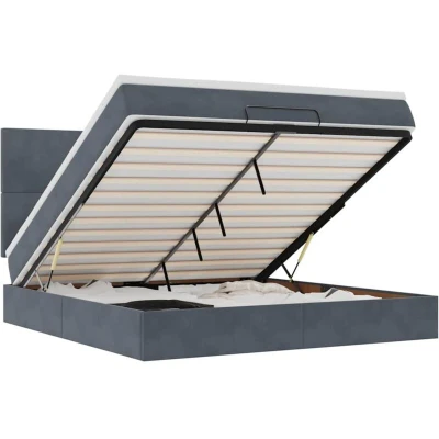 ManoManoGeneral description Use this ottoman bed with mattresses to enjoy a restful night's sleep! It offers both a storage solution and a comfortable sleep experience. Technical specifications Bed frame with headboard: Colour: Dark grey Material: Velvet (100% polyester), metal, plywood, engineered wood Overall dimensions: 203 x 160 x 118/128 cm (L x W x H) Max. weight capacity: 280 kg Mattress: Colour: White and dark grey Material: Velvet (100% polyester) Filling material: Pocket springs, foam Firmness: Medium Dimensions: 160 x 200 x 20 cm (W x L x H) Mattress topper: Colour: White Topper material: Fabric (100% polyester) Filling material: Foam Dimensions: 160 x 200 x 5 cm (W x L x H) Removable and washable cover Compatibility and accessories Delivery contains: 1 x Bed frame 1 x Headboard 1 x Mattress 1 x Mattress topper Installation Assembly required: Yes Usage Soft and comfortable material: Velvet fabric features a soft and smooth surface that delivers a delightful sensation against the