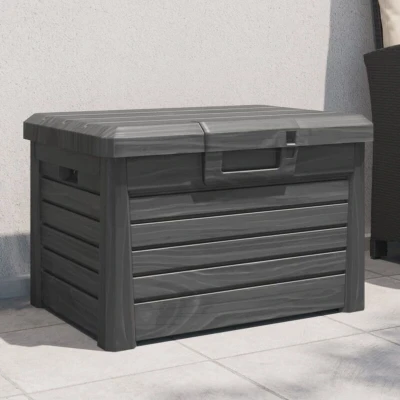 ManoManoGeneral description This cushion box is perfect for storing your cushions, pillows, blankets, toys, and other items in the garden or patio. Made from robust polypropylene, it is designed for stability, heat resistance, and easy cleaning. The box features a lockable design for enhanced security, ensuring your items are safely stored out of reach. Its ample storage space allows for organized storage of various items, while the imitation wood texture design adds a touch of natural charm to your outdoor living space. Technical specifications Colour: Anthracite Material: Polypropylene (PP) Dimensions: 73 x 50.5 x 46.5 cm (W x D x H) Inner dimensions: 64 x 40 x 39 cm (W x D x H) Capacity: 120 L Assembly required: Yes Other information This cushion box cannot be used as a seat. To maintain the beauty of your outdoor furniture, it is recommended to protect it with a waterproof cover.
