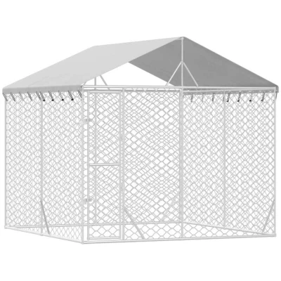 ManoManoGeneral description This practical and spacious outdoor dog kennel with roof is an ideal choice for keeping your animals safe and comfortable. It features a versatile design suitable for dogs, chickens, rabbits, ducks, and other small animals, allowing them to play, exercise, train, or rest. Technical specifications Colour: Silver Material: Galvanised steel, polyethylene (PE) Overall dimensions: 3 x 3 x 2.5 m (L x W x H) Inner dimensions: 2.95 x 2.95 x 2.5 m (L x W x H) Gate size: 52 x 190 cm (W x H) Lockable latch system Assembly required: Yes Other information Attention! Metal wires can be pointed and sharp-edged! Wear safety shoes and protective gloves when setting up!