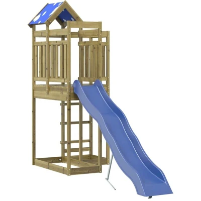 ManoManoGeneral description This wooden outdoor playset transforms your backyard into a playground for imaginative adventures! It is designed to give your children the freedom to play at home, providing endless fun and interactive time for them and their friends. Technical specifications Overall dimensions: 107 x 278 x 239 cm (L x W x H) Play tower dimensions: 102 x 110.5 x 239 cm (L x W x H) Platform height: 118 cm Wave slide dimensions: 210 x 40 cm (L x W) Maximum user weight: 45 kg Roof material: Polyester Play tower material: Vacuum pressure impregnated pinewood Slide material: PP (Polypropylene) Assembly required: Yes Compatibility and accessories Includes: 1 x Play tower, 1 x Wave slide Mounting platform screws (M3.5 x 28) are included Usage This playset is suitable for outdoor use and is designed for children aged 3 to 8 years. It is perfect for creating a fun and safe environment for children to play and explore. Other information Warning: Not suitable for children under 3 years. Only