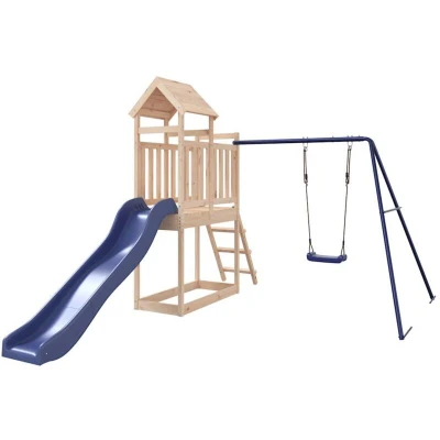 ManoManoGeneral description This wooden outdoor playset transforms your backyard into a playground for imaginative adventures! It is designed to give children the freedom to play at home, featuring a climbing frame with a slide made of solid pine wood, which is not only durable but also adds a rustic charm to your outdoor space. Technical specifications Overall dimensions: 242 x 304 x 214 cm (L x W x H) Play tower: Material: Solid pinewood (untreated) Dimensions: 110 x 64 x 214 cm (L x W x H) Platform height: 90 cm Swing set: Colour: Blue Material: PP (Polypropylene), metal Overall dimensions: 184 x 160 x 162 cm (W x D x H) Swing dimensions: 32.5 x 22 x 112.5 cm (W x D x H) Wave slide: Colour: Blue Material: PP (Polypropylene) Size: 169 x 38.5 cm (L x W) Applicable installation height: 90 cm Total width of the slide: 38.5 cm Sliding part width: 32 cm Maximum user weight: 45 kg Mounting platform screws (M3.5 x 28 mm) are included Features: 1 x Play tower 1 x Ladder 1 x Swing set 1 x Wave slide