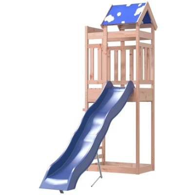 ManoManoGeneral description Do you want to give your children the freedom to play at home? This wooden outdoor playset transforms your backyard into a playground for imaginative adventures! Made from solid douglas wood, this climbing frame is known for its strength and durability, featuring a rich reddish-brown color and unique grain patterns that exude a warm and natural vibe. With good stability and resistance to weathering, it is ideal for crafting both indoor and outdoor furniture. Technical specifications Overall dimensions: 85 x 237 x 239 cm (L x W x H) Play tower material: Solid douglas wood (untreated) Roof material: Polyester Play tower dimensions: 85 x 52.5 x 239 cm (L x W x H) Platform height: 118 cm Wave slide color: Blue Wave slide material: PP (Polypropylene) Wave slide size: 210 x 40 cm (L x W) Applicable installation height for slide: 118 cm Total width of the slide: 40 cm Sliding part width: 32 cm Maximum user weight: 45 kg Assembly required: Yes Usage This fun-filled wooden