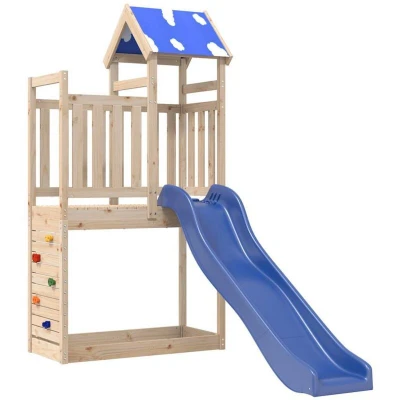 ManoManoGeneral description Transform your backyard into a playground with this wooden outdoor playset, designed to provide children with the freedom to play and engage in imaginative adventures. Made from solid pine wood, this climbing frame is not only durable but also adds a rustic charm to your outdoor space. Technical specifications Overall dimensions: 238.5 x 110.5 x 215 cm (L x W x H) Play tower dimensions: 110.5 x 52.5 x 215 cm (L x W x H) Platform height: 90 cm Wave slide dimensions: 169 x 38.5 cm (L x W) Maximum user weight for slide: 45 kg Roof material: Polyester Play tower material: Solid pinewood (untreated) Slide material: PP (Polypropylene) Usage Recommended user age: 3-8 years old Only for domestic use Outdoor use Other information Assembly required: Yes Features: 1 x Play tower, 1 x Wave slide, 1 x Rockwall Warning: Not suitable for children under 3 years