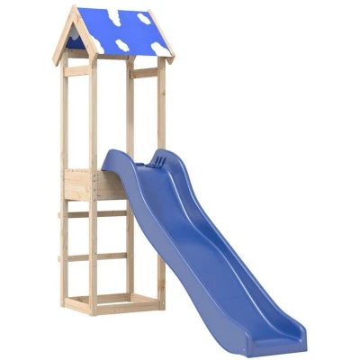 ManoManoGeneral description This durable wooden outdoor playset is crafted from solid pine wood and features a play tower with a 90 cm high platform, a blue wave slide, and a sandpit. The cloud roof provides shade on hot days, making it a versatile backyard playground for children aged 3–8 to enjoy with friends. Overall dimensions are 64 x 194 x 195 cm (L x W x H). Technical specifications Overall dimensions: 64 x 194 x 195 cm (L x W x H) Play tower material: Solid pinewood (untreated) Roof material: Polyester Play tower dimensions: 52.5 x 46.5 x 195 cm (L x W x H) Wave slide dimensions: 169 x 38.5 cm (L x W) Total width of the slide: 38.5 cm Sliding part width: 32 cm Platform height: 90 cm Maximum user weight: 45 kg Applicable installation height: 90 cm Color: Blue Slide material: PP (Polypropylene) Assembly: Yes Mounting platform screws included: M3.5 x 28 mm Installation Assembly required: Yes Mounting platform screws included: M3.5 x 28 mm Usage For domestic outdoor use only Not suitable