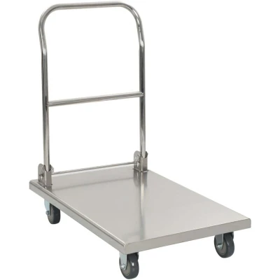 General description This multi-purpose platform wagon is safe and effortless, making it perfectly suitable for transporting heavy objects in kitchens, hotels, or warehouses. Made of stainless steel, the platform cart is highly durable and hardwearing, with a maximum load capacity of 200 kg. It can be easily folded by foot control to save space when not in use and is equipped with 2 swivel castors and 2 fixed castors for smooth and quiet transport. The platform wagon is easy to assemble. Technical specifications Colour: Silver Material: Stainless steel Castor material: TPR (thermoplastic rubber) Overall dimensions: 82 x 53 x 86 cm (L x W x H) Castor diameter: 100 mm Maximum load capacity: 200 kg With 2 fixed castors and 2 swivel castors Foldable Features anti-shock design Other information
