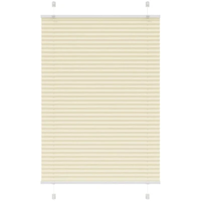 ManoManoGeneral description Elevate your room's style and functionality with this pleated blind, offering privacy and elegance. Made from 100% polyester, the pleated blind is durable, low maintenance, and built to resist wear and tear. It provides optimal privacy and glare protection with its pleated fabric, allowing you to adjust the level of privacy by moving it up or down. The sleek and modern design complements various room decors, making it suitable for living rooms, bedrooms, offices, and more. Technical specifications Colour: Cream Material: 100% polyester Total height: 150 cm Total width: 100 cm Fabric width: 99.4 cm (tolerance ± 2 mm) With difference: 0.6 cm Window frame thickness range: 0.5-2.3 cm Assembly required: Yes Compatibility and accessories Two assembly methods: with screws or without drilling using clamping brackets Mounting accessories included Usage Before purchasing, measure your window glass. To ensure complete coverage, add 0.6 cm to the width of the window glass when