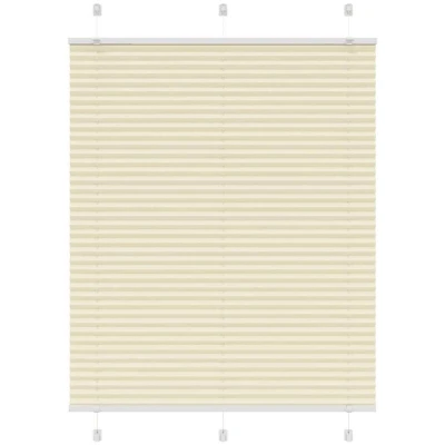 ManoManoGeneral description Elevate your room's style and functionality with this pleated blind, offering privacy and elegance. Made from 100% polyester, the pleated blind is built to last and resist wear and tear. It is easy to clean, typically requiring light dusting or wiping with a damp cloth. Technical specifications Colour: Cream Material: 100% polyester Total height: 150 cm Total width: 110 cm Fabric width: 109.4 cm (tolerance ± 2 mm) With difference: 0.6 cm Window frame thickness range: 0.5-2.3 cm Assembly required: Yes Compatibility and accessories Two assembly methods: with screws or without drilling using clamping brackets Mounting accessories included Usage The blind is not transparent but also not fully darkening, providing optimal privacy and glare protection with its pleated fabric. You can adjust the level of privacy by moving it up or down. It is suitable for use in various settings, including the living room, bedroom, and office. Other information Warning: Keep cords out of