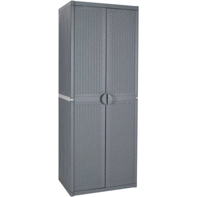ManoManoGeneral description This garden storage cabinet features a practical design and is a real eye-catcher for your home decor. Technical specifications Colour: Grey Material: 100% PP (polypropylene) with a rattan look Dimensions: 65 x 45 x 172 cm (W x D x H) With 4 shelves Rattan look Installation To make assembly as easy as possible, each product is delivered with a manual. To prevent it from being overturned, this product must be used with the wall attachment device (not provided). Other information