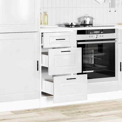 ManoManoGeneral description This kitchen base cabinet optimizes your kitchen space, providing ample storage for your personal belongings. It features a high gloss white finish and is made from durable engineered wood, ensuring stability and resistance to moisture, warping, and splitting. Technical specifications Colour: High gloss white Material: Engineered wood Overall dimensions: 40 x 46 x 81.5 cm (W x D x H) Drawer dimensions: 40 x 38.5 x 16/27 cm (W x D x H) Maximum load capacity (total): 50 kg Range name: Porto With adjustable feet The worktop is not included in the delivery Assembly required: Yes Installation In order to prevent overturning, this product must be used with the wall attachment device provided. Screw(s) and plug(s) for inside the wall are not included; seek and use screw(s) and plug(s) suitable for your walls. If you are uncertain, seek professional advice. Read and follow each step of the instruction carefully. Usage Ample storage space for bowls, plates, pots, and other