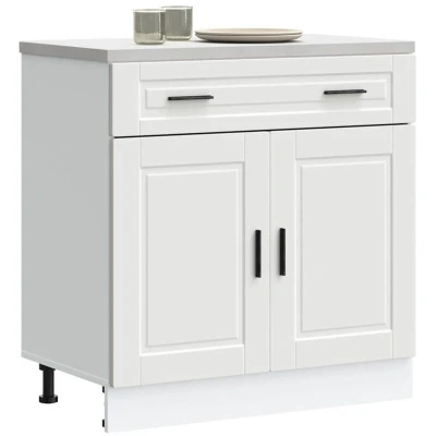 ManoManoGeneral description This kitchen base cabinet optimizes your kitchen space, providing ample storage for your personal belongings. It features practical doors that help maintain a clean and organized space by concealing kitchen appliances and clutter. Technical specifications Colour: White Material: Engineered wood Overall dimensions: 80 x 46 x 81.5 cm (W x D x H) Drawer dimensions: 80 x 38.5 x 16 cm (W x D x H) Cabinet dimensions: 77 x 46 x 54 cm (W x D x H) Maximum weight capacity: 70 kg Weight capacity per layer: 25 kg Range name: Porto With adjustable feet The worktop is not included in the delivery Assembly required: Yes Installation To prevent tipping, this product must be used with the provided wall attachment device. Screw(s) and plug(s) for inside the wall are not included; seek and use suitable screw(s) and plug(s) for your walls. If uncertain, seek professional advice. Read and follow each step of the instruction carefully. Usage Easy to maintain: Thanks to its smooth