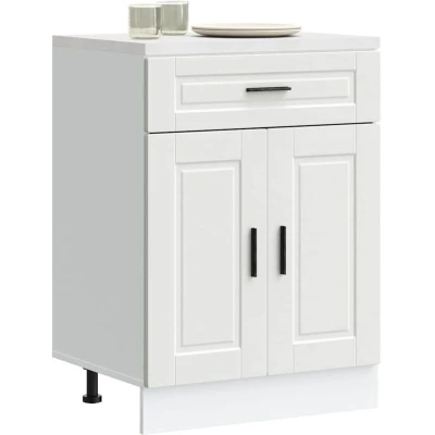 ManoManoGeneral description This kitchen base cabinet optimizes your kitchen space, providing ample storage for your personal belongings. It features practical doors that help maintain a clean and organized area by concealing kitchen appliances and clutter. Technical specifications Colour: White Material: Engineered wood Overall dimensions: 60 x 46 x 81.5 cm (W x D x H) Drawer dimensions: 60 x 38.5 x 16 cm (W x D x H) Cabinet dimensions: 57 x 46 x 54 cm (W x D x H) Maximum weight capacity: 70 kg Weight capacity per layer: 25 kg Range name: Porto With adjustable feet The worktop is not included in the delivery Assembly required: Yes Installation To prevent tipping, this product must be used with the provided wall attachment device. Screw(s) and plug(s) for inside the wall are not included; seek and use suitable screw(s) and plug(s) for your walls. If uncertain, seek professional advice. Read and follow each step of the instruction carefully. Usage Easy to maintain: Thanks to its smooth