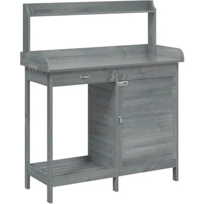 ManoManoGeneral description This wooden potting table is perfect for organizing and displaying your potted plants at home, in a garden, on a patio, or on a terrace. Made of solid fir wood, it offers sturdiness and stability while maintaining its integrity even when exposed to moisture. The potting workbench features versatile storage options, including a top rail, a bottom shelf, a drawer, a storage cabinet, and metal hooks on the side, providing ample space for gardening tools, soil, fertilizers, and more. Technical specifications Color: Grey Material: Solid fir wood Dimensions: 110.5 x 45 x 124.5 cm (L x W x H) Worktop size: 107 x 43 cm (L x W) Drawer inner dimensions: 49 x 36.5 x 6 cm (W x D x H) Cabinet inner dimensions: 40 x 40 x 57 cm (W x D x H) Tabletop height: 84 cm Maximum loading capacity: 50 kg With zinc-covered tabletop Assembly required: Yes Usage Ideal for organizing and displaying potted plants. Can be used in courtyards, gardens, greenhouses, and patios. Other information To
