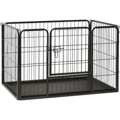 General description Our versatile playpen is ideal for your puppies to play, exercise, train, or simply for keeping them safe. It will be the perfect play paradise for your furry friends! This dog playpen can be easily set up or taken down and features a hinged door with a security latch for easy access. Made of durable and weather-resistant rustproof powder-coated steel, it is suitable for both outdoor and indoor use. A plastic bottom tray is also included. Technical specifications Colour: Black Material: Powder-coated steel Overall dimensions: 91.5 x 59 x 61 cm (W x D x H) Door size: 31 x 42 cm (W x H) Includes 1 hinged door with a security latch Easy to assemble Includes a plastic bottom tray Other information