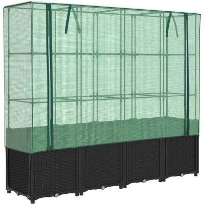 General description This raised bed with a greenhouse cover provides ample growing space with its sturdy supporting frame. Constructed from polypropylene, it features a robust iron tube frame that allows plants to grow and climb. The water-resistant polyethylene cover protects your plants from extreme temperatures and keeps out insects, birds, and small animals. The design includes zippers for ventilation and ropes for securing the net to the tube, adding practicality to its rattan look that enhances your outdoor living space. Ideal for gardens, courtyards, balconies, and more, this raised bed is perfect for growing plants, vegetables, herbs, and flowers. Technical specifications Raised bed dimensions: 160 x 40 x 53 cm (L x W x H) Greenhouse dimensions: 160 x 40 x 110 cm (L x W x H) Tube dimensions: 160 x 40 x 120 cm (L x W x H) Overall dimensions: 160 x 40 x 153 cm (L x W x H) Raised bed color: Black Net color: Green Raised bed material: PP (polypropylene) Net material: PE