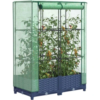 General description This raised bed with a greenhouse cover provides ample growing space with its sturdy supporting frame. Constructed from polypropylene, it features a robust iron tube frame that allows plants to grow and climb through it. The water-resistant polyethylene cover protects your plants from extreme temperatures and keeps out insects, birds, and small animals. With zippers for ventilation and ropes for securing the net, this raised bed combines functionality with a charming rattan look design, making it a great addition to any outdoor living space. Technical specifications Raised bed dimensions: 80 x 40 x 23 cm (L x W x H) Greenhouse dimensions: 80 x 40 x 110 cm (L x W x H) Tube dimensions: 80 x 40 x 120 cm (L x W x H) Overall dimensions: 80 x 40 x 123 cm (L x W x H) Raised bed colour: Blue grey Net colour: Green Raised bed material: PP (polypropylene) Net material: PE (Polyethylene) Tube material: Iron With water-resistant greenhouse cover Assembly required: Yes Other