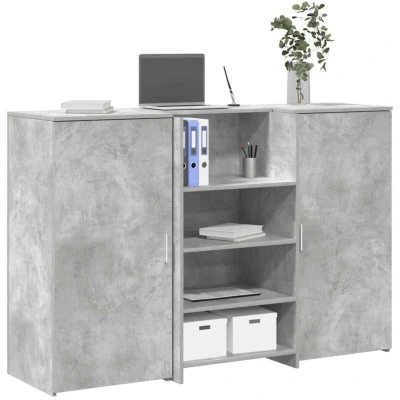 ManoManoGeneral description Enjoy seamless interactions, ample storage, and a versatile design with this reception desk featuring a built-in counter, making it perfect for various settings. The high counters and side panels ensure discreet interactions, providing a balance of functionality and privacy for both staff and visitors. This checkout counter is ideal for corporate offices, hotel lobbies, medical clinics, and beauty salons, meeting various professional needs. Technical specifications Colour: Concrete grey Material: Engineered wood Overall dimensions: 155 x 50 x 103.5 cm (L x W x H) Reception Desk dimensions: 55 x 50 x 103.5 cm (L x W x H) Storage cabinet dimensions (each): 50 x 45 x 103.5 cm (L x W x H) Max weight capacity (total): 60 kg Max weight capacity (top layer): 20 kg Max weight capacity (shelf): 20 kg Assembly required: Yes Installation Clear instructions and a simple assembly process make this reception counter desk easy to set up quickly and effortlessly. To prevent it