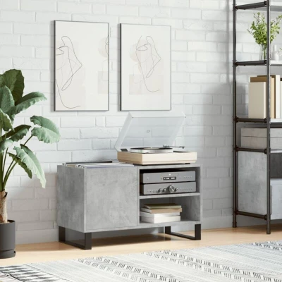 ManoManoGeneral description Store and showcase your vinyl records with this practical and classic record cabinet. Designed with ample storage space, it keeps your music collection well-organized while adding a stylish touch to your interior. Technical specifications Colour: Concrete grey Material: Engineered wood, iron Overall dimensions: 85 x 38 x 48 cm (W x D x H) Feet height: 10 cm Assembly required: Yes Other information