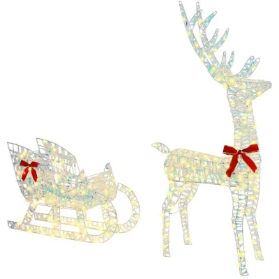 ManoManoGeneral description This Reindeer Pull Sleigh is the perfect addition to any holiday setting, combining modern aesthetics with timeless festive charm. Designed for those who cherish the Christmas spirit, this eye-catching decorative piece adds character and warmth to any space, whether placed in a living room, hall, or garden. Featuring a charming reindeer pulling a sleigh, it perfectly encapsulates the joy and wonder of the holiday season. Adorned with warm white LED lights, this decoration casts a serene glow, harmonizing beautifully in both indoor and outdoor environments, showcasing sophistication and festive elegance. Crafted to complement various holiday themes, its sleek, modern style respects the essence of traditional festivity while providing a contemporary twist. Technical specifications Colour: Warm white Material: PET Overall dimensions: 70 x 26 x 128.5 cm (L x W x H) Number of LEDs: 200 Distance between LEDs: 10 cm Power source: USB Durable and weather resistant