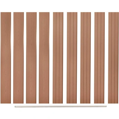 ManoManoGeneral description The Replacement Fence Boards are designed to serve as a durable and stylish option for garden barriers or residential fences, providing privacy and security. Made from wood-plastic composite (WPC), these boards feature a wood grain print on one side and a regular print on the other, allowing you to choose your preferred design. They require no additional treatment such as oiling or painting, making them low maintenance. Technical specifications Colour: Brown Material: Wood-plastic composite + aluminium top profile Board size (each): 170 x 20.3 cm (L x W) Board thickness: 2 cm Ending bar length: 170 cm Delivery includes: 9 fence boards and 1 aluminium ending bar Assemble time: Approx. 0.5 h SKU: 45039 Other information