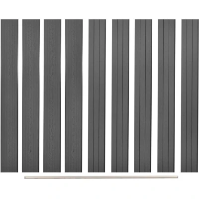 ManoManoGeneral description The Replacement Fence Boards are designed to serve as a durable and stylish option for garden barriers or residential fences, providing privacy and security. Made from wood-plastic composite (WPC), these boards feature a wood grain print on one side and a regular print on the other, allowing you to choose your preferred design. They require no additional treatment such as oiling or painting, making maintenance easy. Technical specifications Colour: Grey Material: Wood-plastic composite + aluminium top profile Board size (each): 170 x 20.3 cm (L x W) Board thickness: 2 cm Ending bar length: 170 cm Delivery includes: 9 fence boards and 1 aluminium ending bar Assemble time: Approx. 0.5 h SKU: 45040 Compatibility and accessories These fence boards are replacements for fence panel sets (SKU 3053225-3053242, 3054431). Replacement posts are also available (SKU 49076-49077 and 148986-148987). Other information