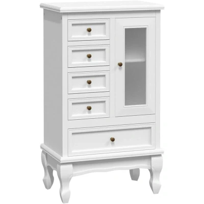General description This cabinet features an antique design, making it a stylish organizer for various spaces such as the office, living room, bedroom, or hallway. It includes five drawers for storing books, clothes, and other items, along with two large display shelves that provide ample room for additional storage and decoration. The acrylic door helps keep dust and dirt away, ensuring your items remain clean. Technical specifications Colour: White Material: MDF + pinewood Overall size: 53 x 30.5 x 95.5 cm (L x W x H) Number of drawers: 5 Number of shelves: 2 Max. load capacity (total): 75 kg Max. load capacity (big drawer): 4 kg Max. load capacity (small drawer): 2 kg Max. load capacity per shelf: 5 kg Includes an acrylic door and iron knobs Other information WARNING: To prevent overturning, this product must be used with the wall attachment device provided. Do not use this item if any components are broken, torn, or missing.