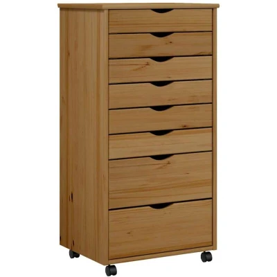 ManoManoGeneral description This rolling cabinet with drawers enhances your workspace by keeping items organized and easily accessible. It features flexible wheels for easy mobility, ample storage space for documents, books, or files, and a concave handle for effortless drawer access. Made from solid pine wood, it boasts a rustic look that fits well in any room, making it a versatile storage solution for your living room, bedroom, kitchen, garage, office, or craft room. Technical specifications Colour: Honey brown Material: Solid pine wood, engineered wood, plastic Dimensions: 53 x 39 x 103 cm (W x D x H) Drawer outer dimensions: 47 x 34 x 18.5/9 cm (W x D x H) Drawer inner dimensions: 43.6 cm x 30.8 cm x 15/7 cm (W x D x H) Number of drawers: 8 Assembly required: Yes Other information