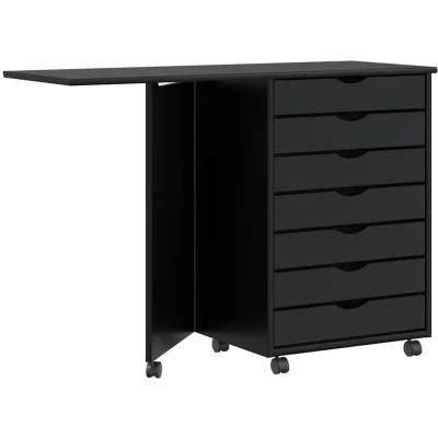 ManoManoGeneral description This rolling cabinet with desk helps you work better by keeping things organized and within easy reach. The office cabinet is designed to maximize storage capacity while maintaining a minimal overall footprint. Its foldable design allows the desktop to be folded up to save space according to your needs. The spacious tabletop provides ample space for your laptop, clocks, and other office supplies, while the cabinet features drawers for storing books, folders, and other items. The concave handle allows easy access to each drawer. Made from solid pine wood, this cabinet combines functionality with a rustic aesthetic, making it suitable for various settings. Technical specifications Color: Black Material: Solid pine wood, engineered wood, plastic Overall dimensions: 105.5 x 39 x 74.5 cm (W x D x H) Drawer outer dimensions: 46.5 x 34 x 9 cm (W x D x H) Drawer inner dimensions: 45 x 33.5 x 7 cm (W x D x H) Number of drawers: 7 Assembly required: Yes Range: MOSS Usage