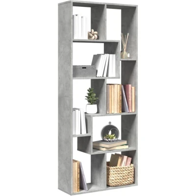 ManoManoGeneral description The contemporary room divider bookcase blends a geometric shape design with storage, perfect for organizing your space with style. This versatile shelving unit can be used as a room divider and fits seamlessly into any room, whether in the living room for displaying decorations, in the study for storing books and documents, in the bedroom for everyday items, or in the basement for miscellaneous storage. Technical specifications Colour: Concrete grey Material: Engineered wood Overall dimensions: 67 x 25 x 161.5 cm (W x D x H) Number of compartments: 8 Total weight capacity: 100 kg Weight capacity of each compartment: 10 kg Assembly required: Yes Installation To prevent tipping, this product must be used with the provided wall attachment device. Screws and plugs for inside the wall are not included; it is advised to use screws and plugs suitable for your walls. Please read and follow each step of the instructions carefully. Usage Easy to clean with a damp cloth due
