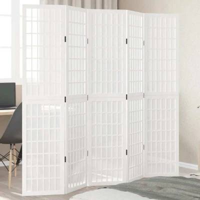 vidaXL Room Divider White 5 Panel Folding Partition Screen, Solid Paulownia Wood Frame, for Bedroom/Office/Living 175 180cm x