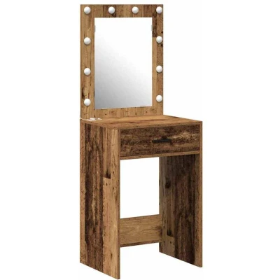 ManoManoGeneral description This modern dressing table combines simplicity and functionality, making it a perfect fit for any bedroom style. Its neat design with clean lines exudes understated elegance, ideal for contemporary spaces. The built-in LED lights provide excellent brightness, making it perfect for tasks like makeup application or hairstyling, giving you a salon-like experience at home. Additionally, the spacious storage options help keep your personal items organized and easily accessible. Technical specifications Colour: Old wood Material: Engineered wood Overall dimensions: 50 x 41 x 135 cm (L x W x H) Weight: 18.3 kg Power source: Plug Number of drawers: 2 Includes: Plane mirror Indoor use only Assembly required: Yes EAN: 8721158850720 SKU: 865044 Usage Ideal for makeup application and hairstyling. Easy to maintain; simply wipe with a damp cloth. Other information Please use only certified DC 5V input. Higher voltage may cause overheating and damage to the device. Do not connect