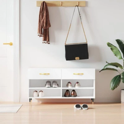 ManoManoGeneral description Store your shoes with this stylish and practical shoe bench. It is a perfect choice to keep your shoes organized. Technical specifications Colour: White Material: Engineered wood, iron Dimensions: 102 x 35 x 55 cm (W x D x H) Feet height: 10 cm Maximum weight capacity: 110 kg per seat Assembly required: Yes Usage The shoe bench features a sturdy top that allows you to sit comfortably while taking your shoes off or putting them on. It has 2 drawers and 4 shelves, providing ample space for your shoes and other small items. Other information Warning: To prevent it from being overturned, this product must be used with the provided wall attachment device.