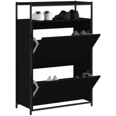 General description This shoe cabinet is an excellent choice for organizing your shoes, especially in tight spaces, thanks to its compact design. It features a durable engineered wood construction that offers strength, stability, and moisture resistance. Technical specifications Colour: Black Material: Engineered wood Dimensions: 75 x 34 x 112 cm (W x D x H) Maximum load capacity: 50 kg Assembly required: Yes Installation To prevent tipping, this product must be used with the provided wall attachment device. Usage This shoe rack features 1 shelf and 2 flip drawers, providing ample space to keep your shoes within reach and well organized. The sturdy top of the shoe cupboard is ideal for displaying decorative objects, photo frames, or potted plants. Designed to fit small spaces like entryways, hallways, and mudrooms. Other information