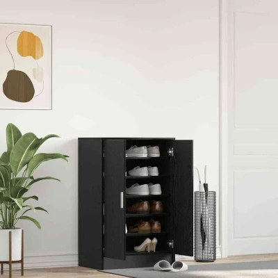 ManoManoGeneral description Keep your shoes away from cluttering and create a tidy environment with this elegant shoe cabinet! This cabinet is designed to provide ample storage space for a variety of shoes, keeping them neatly organized and easy to access. The practical doors help maintain a neat appearance while protecting your shoes from dust and dirt. Technical specifications Colour: Black oak Material: Engineered wood Dimensions: 60 x 35 x 92 cm (W x D x H) Assembly required: Yes Usage The sturdy top shelf of the shoe cabinet is ideal for displaying decorative objects, photo frames, or storing items like keys or wallets that you might need within reach. Thanks to its smooth surface, the shoe organizer is easy to clean with a damp cloth and requires less maintenance. Other information Warning: To prevent it from tipping over, this product must be used with the provided wall attachment device.