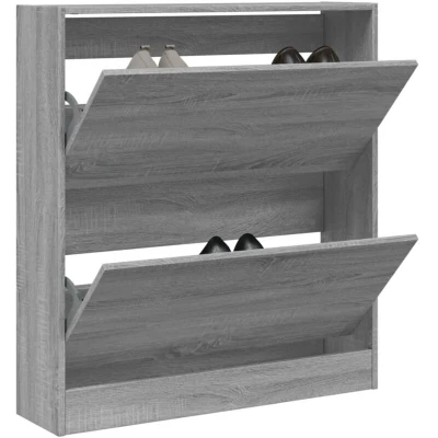 General description This shoe cabinet is an excellent choice for storing your shoes in an organized manner, especially in tight and narrow spaces thanks to its compact design. The engineered wood construction ensures durability and a smooth surface, providing strength, stability, and moisture resistance. Technical specifications Colour: Grey sonoma Material: Engineered wood Dimensions: 80 x 21 x 87.5 cm (W x D x H) Maximum load capacity: 40 kg Assembly required: Yes Installation To prevent tipping, this product must be used with the provided wall attachment device. Usage This shoe rack features 2 flip drawers, providing ample space to keep your shoes within reach and well organized. The sturdy top of the shoe cupboard is ideal for displaying decorative objects, photo frames, or potted plants. The slim design makes it suitable for small spaces like entryways, hallways, and mudrooms. Other information
