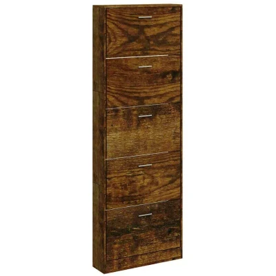 ManoManoGeneral description This shoe cabinet, designed in a modern and stylish manner, is an excellent piece of furniture for organizing your shoes. It is suitable for various spaces including the entrance, hallway, living room, and bedroom. Technical specifications Colour: Smoked oak Material: Engineered wood Dimensions: 59 x 17 x 169 cm (W x D x H) Drawer height: 31.5 cm Drawer size: 51.5 x 9.5 cm (L x W) Installation Each product comes with an assembly manual in the box for easy assembly. To prevent overturning, this product must be used with the wall attachment device provided. Usage Features 5 drawers for ample storage space to keep your shoes organized and within reach. Pull-down drawer design allows for easy opening and closing. Other information