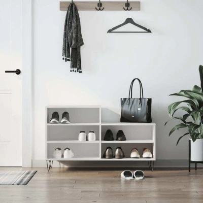 ManoManoGeneral description Keep your shoes away from dust and cluttering to create a tidy environment with this elegant shoe cabinet! Made from high-quality engineered wood, this cabinet features a smooth surface, strength, stability, and moisture resistance. It is easy to clean and offers ample storage space with 5 compartments for organizing your shoes and other items. Technical specifications Colour: White Material: Engineered wood, metal Dimensions: 102 x 36 x 60 cm (W x D x H) Assembly required: Yes Usage The sturdy top of the shoe cupboard is ideal for displaying decorative objects, photo frames, or potted plants. To prevent the cabinet from being overturned, it must be used with the provided wall attachment device. Other information