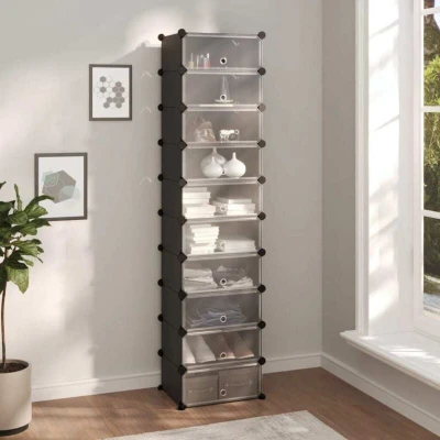 General description This shoe rack provides a great storage solution for your collection of favorite footwear and other accessories. Made from waterproof PP plastic panels and supported by a strong steel frame, this shoe organizer is both practical and durable. Its user-friendly design allows for easy assembly with the included wood hammer, and when not in use, the panels can be conveniently separated and stacked to save space. With ample storage space, it helps keep your items organized and is suitable for various settings including homes, dormitories, and offices. Technical specifications Colour: Black Material: PP (Polypropylene), steel Overall dimensions: 44 x 32 x 174 cm (L x W x H) Each panel size (L): 40 x 30 cm (L x W) Each panel size (M): 40 x 17 cm (L x W) Each panel size (S): 30 x 17 cm (L x W) Door size: 40 x 17 cm (L x W) Maximum loading capacity of each cube: 10 kg Assembly required: Yes Other information