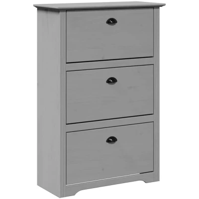 Keep your shoes away from cluttering and create a tidy environment with this elegant shoe rack! Durable material: Solid pinewood is known for its strength and durability. Its straight grains and distinctive knots contribute to its rustic charm. Engineered wood is a durable and stable material with a smooth surface that is resistant to moisture, warping, and splitting, making it a reliable choice for a variety of projects.Ample storage space: The shoe cabinet has 3 drawers, providing ample space for shoe storage. With this handy shoe organiser, you will no longer be annoyed by shoes cluttering your floor.Practical top: The sturdy top shelf of the shoe storage is ideal for displaying decorative objects, photo frames, or storing something like keys or wallets you might need within reach.Easy to use: The metal handles of the drawers make it convenient to open and close and make the shoe cupboard more attractive.Easy to maintain: Thanks to its smooth surface, the shoe organiser is easy to clean and only needs a wipe with a dry cloth. Good to know:Screws and plugs for inside the wall are not included. We advise to find and use screws and plugs suitable specifically for your walls. If you're not sure, you can consult with a professional. Please read and follow each step of the instructions. Warning:To prevent it from tipping over, this product must be used with the provided wall attachment device.