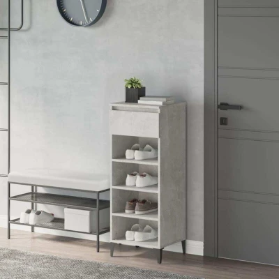 ManoManoGeneral description Keep your shoes organized and your space tidy with this elegant shoe rack. Designed with a modern concrete grey finish, it combines functionality with style, making it a perfect addition to any home. Technical specifications Material: Engineered wood, metal Dimensions: 40 x 36 x 105 cm (W x D x H) Installation Each product comes with an assembly manual in the box for easy assembly. To prevent overturning, this product must be used with the wall attachment device provided. Usage This shoe storage features a drawer and 3 shelves, providing ample space to keep your shoes within reach and well organized. The sturdy top is ideal for displaying decorative objects, photo frames, or potted plants. Other information