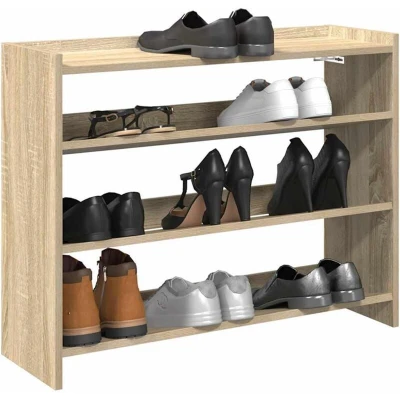 ManoManoGeneral description Keep your shoes organized and create a tidy environment with this elegant shoe rack. Designed to fit small spaces like entryways and hallways, it offers ample storage while enhancing your decor. Technical specifications Colour: Sonoma oak Material: Engineered wood Overall dimensions: 80 x 25 x 62 cm (W x D x H) Maximum weight capacity: 60 kg Assembly required: Yes Usage Store shoes on the shelves to keep your floor clutter-free. Use the top shelf for displaying decorative items or storing essentials like keys and wallets. Other information Warning: To prevent tipping, use the provided wall attachment device.