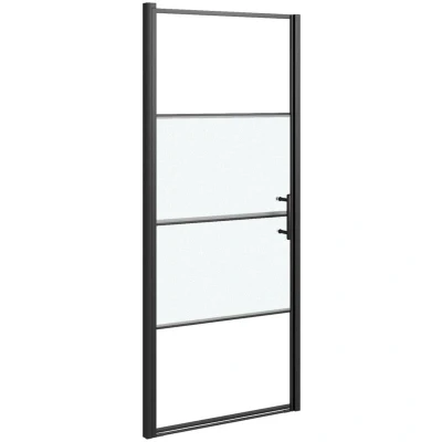 General description Bring an air of industrial aesthetics to your bathroom with this modern shower door. This shower enclosure features ESG glass supported by a heavy-duty aluminium frame, ensuring a strong structure once mounted. The adjustable profile makes it easy to fit any bathroom size and layout, while the half frosted tempered glass adds a stylish touch. Technical specifications Frame colour: Black Material: Half frosted tempered ESG glass, aluminium, stainless steel Dimensions: (78 - 81) x 195 cm (W x H) Frame adjustable in width: 3 cm Tempered glass thickness: 5 mm With zinc alloy pivot Splash-resistant Assembly required: Yes Other information Children should be supervised to ensure that they do not play with the appliance. Keep children away from the assembly area. Attention: Reading the instructions carefully before use and keep it for further reference.