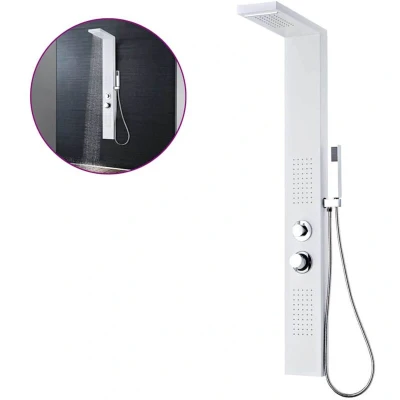 ManoManoGeneral description This multifunctional shower panel system features a stylish matte white design, making it a great addition to your bathroom. Constructed from durable aluminium, the shower tower showcases a beautiful square design. It offers four functions: rainfall, waterfall, massage jets, and a handheld showerhead, all easily selectable via a knob. Immerse yourself in a truly relaxing shower experience with this modern shower panel system! Technical specifications Colour: Matte white Panel material: Aluminium Handheld showerhead and knobs: Chrome plated Dimensions: 15 x 47 x 130 cm (W x D x H) Waterfall width: 12.5 cm Rainfall shower size: 23 x 14 cm (L x W) Massage jets size (each set): 20.5 x 10.8 cm (L x W) Handheld shower size: 2.8 x 2.8 x 21 cm (W x D x H) Stainless steel hose length: 150 cm Functions: Rainfall, waterfall, 2 sets of body massage jets, handheld showerhead 150 jets with silicon nozzles: 50 on the rainfall showerhead and 50 on each set of body massage jets