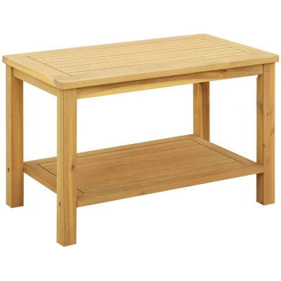 This Garden Side Table, meticulously crafted from solid acacia wood, serves as a versatile accent for any space, offering both durability and rustic charm. Its rugged style brings a touch of natural beauty to gardens, patios, backyards, and even indoor settings, while its sleek design complements modern and traditional decor alike. Ideal for those looking to add functional elegance to their surroundings, this table supports beverages, books, and decorative items with a robust yet stylish appearance. Materials: This table is crafted entirely from solid acacia wood, known for its resilience and attractive grain patterns. The use of this material ensures enduring performance, making the table capable of withstanding daily wear without losing its charm. The natural brown hues of the wood add warmth and character, seamlessly fitting into rustic and contemporary environments. Included Components: Designed with board shelves and a solid acacia frame, this table offers reliable support for your essentials. The post leg, also made from solid acacia wood, complements the structural integrity of the piece, ensuring stability and longevity. Its practical design enhances usability, making it an accessible addition to any setup. Features /Function /Design: The rustic style of this side table blends effortlessly with both indoor and outdoor spaces, offering a versatile design that meets aesthetic and functional needs. Durable construction ensures it remains a fixture whether stationed by the poolside, in the garden, or within the cozy corners of a living room, embodying function and form. Recommended Uses: Perfect for patios, gardens, or poolside setups, this side table serves as an ideal platform for leisurely afternoons or social gatherings. Its understated look allows for incidental use, from holding refreshments to showcasing potted plants, making it invaluable for hosts or nature enthusiasts. Care &Maintenance: Maintaining the table's pristine appearance is straightforward. Simply wipe it with a damp cloth to remove dust and debris, preserving its natural sheen. For longevity, shield it during adverse weather conditions, safeguarding this investment for seasons to come.