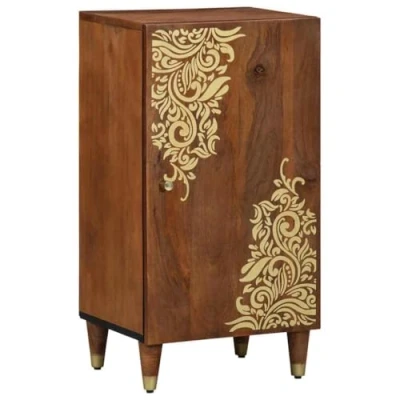 This elegant sideboard adds both style and practicality to your living room or dining area. Designed in a modern style, its clean lines and gold accents make it an eye-catching piece, while its sturdy solid mango wood construction ensures longevity. The simplistic yet functional design of this sideboard makes it a perfect addition for those seeking a sleek furniture piece that offers ample storage. Sturdy Materials: Constructed from high-quality solid mango wood, this sideboard offers durability and a natural touch to your home. Its robustness makes it a reliable choice for heavy storage purposes, and its fine grain structure adds a touch of rustic elegance. Decorative Gold Accents: With intricate gold screen-printed designs on its exterior, it brings a luxurious touch to your interiors. These highlights are perfectly complemented by the lustrous brass hardware, which emphasizes its contemporary appearance. Functional Brass Components: Equipped with sleek brass knobs and supported by strong brass legs, the sideboard provides both aesthetic appeal and functional support. The brass components are built to withstand daily use, contributing to the sideboard's longevity. Efficient Door Design: Featuring a hinged door mechanism, the sideboard offers accessible storage, allowing you to store and organize your items conveniently. The door opens smoothly and closes securely, maintaining the sideboard's streamlined look. Easy Maintenance: To maintain its luster, simply wipe the sideboard with a dry cloth. This ensures the sideboard retains its pristine appearance over time, without the need for extensive upkeep.
