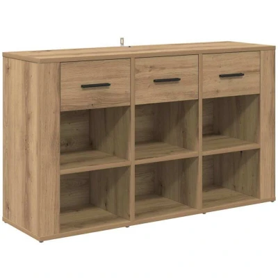 This chic sideboard combines rustic charm with practical storage solutions, offering a stylish and versatile piece for your living room or dining area. Crafted from engineered wood, its textured surface and natural tones beautifully complement any décor while providing substantial space to store or display your essentials. Sturdy Construction Engineered wood craftsmanship ensures long-lasting durability while maintaining a sophisticated appearance. It's designed to withstand daily use, providing reliable support for items placed on its surface or inside its compartments. Generous Storage Space Featuring a collection of compartments, drawers, and board shelves, this sideboard offers ample room to organize dinnerware, linens, or decorative pieces. Shelves crafted from engineered wood offer reliability, while partitions prevent clutter. Stylish Rustic Design With a natural finish and matte black details, this sideboard exudes rugged elegance, making it a fitting addition to a rustic or modern setting. Its attractive design effortlessly enhances the aesthetic appeal of your room. Convenient Drawer Function Smooth ball-bearing slides make the drawers easy to open, providing a effortless access to items stored inside. The engineered wood drawers are both functional and durable, handling your storage needs with ease. Effortless Maintenance To maintain its flawless appearance, simply wipe the sideboard with a damp cloth. Easy to clean and care for, this sideboard is designed for longevity, staying beautiful with minimal upkeep.