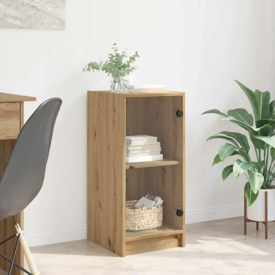 ManoManoGeneral description This modern sideboard features a sleek, smooth finish with clear glass doors, adding a touch of elegance to any dining or living room. Its rectangular design caters to serious storage needs, making it ideal for homeowners looking to enhance both style and organization. The polished look is complemented by a matte finish, providing a subtle elegance that fits seamlessly with contemporary home decor. Its practical design adds value, appealing to those who desire functionality without compromising aesthetics. Technical specifications Colour: Artisan oak Material: Engineered wood Overall dimensions: 35 x 37 x 75.5 cm (L x W x H) With 1 glass door Assembly required: Yes EAN: 8721288923721 SKU: 882896 Brand: vidaXL Usage The sideboard includes shelves made from engineered wood, allowing for easy organization of items or display of decorative pieces. Maintaining the sideboard is straightforward; simply wipe it down with a dry cloth to remove dust, avoiding harsh chemicals