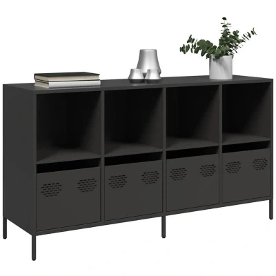ManoManoGeneral description This sideboard with a practical design is a real eye-catcher for your home decor. It features a robust and stable construction made from cold-rolled steel, which provides a smoother surface, higher strength, and greater precision. The ample storage space includes four drawers and four compartments, making it easy to keep your daily essentials organized and within reach. The sturdy tabletop is perfect for displaying decorative items, photo albums, or small plants. Additionally, the smooth surface allows for easy cleaning and maintenance. Technical specifications Colour: Black Material: Cold-rolled steel Dimensions: 135 x 39 x 73.5 cm (L x W x H) With 4 drawers and 4 compartments Assembly required: Yes Other information Warning: To prevent it from tipping over, this product must be used with the provided wall attachment device.