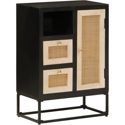 General description This wooden sideboard will make a practical and decorative addition to your home decor. Made from solid mango wood, it is a strong, tropical hardwood that ensures sturdy furniture. Its beautiful wood grains make every piece unique, adding character to your space. Technical specifications Colour: Black Material: Solid mango wood and iron Dimensions: 55 x 30 x 76 cm (L x W x H) Assembly required: Yes SKU: 372001 Usage Ample storage space to keep things organized and within easy reach. The stable top is perfect for displaying decorative items, picture frames, and potted plants. The sturdy iron legs enhance the sideboard's stability. Other information Warning: To prevent it from tipping over, this product must be used with the provided wall attachment device.