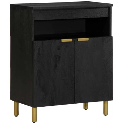 ManoManoGeneral description This sideboard offers both decorative appeal and practical storage, making it a perfect addition to your home. It features a sleek black finish and is made from engineered wood, providing a stable and durable solution for various storage needs. Technical specifications Colour: Black Material: Engineered wood, solid mango wood, brass Overall dimensions: 60 x 33 x 75 cm (L x W x H) Feet height: 10 cm Assembly required: Yes Usage This side cabinet can be used as a bathroom cabinet, kitchen cupboard, or as an elegant storage solution in bedrooms, powder rooms, entryways, corridors, offices, dining rooms, and other living areas. Other information Warning: To prevent it from tipping over, this product must be used with the provided wall attachment device. SKU: 4017673