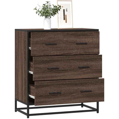 ManoManoGeneral description This modern sideboard, featuring a timeless look, is an excellent addition to your home. The combination of engineered wood and a metal frame enhances your interior with an industrial style while providing exceptional durability and stability. Technical specifications Colour: Brown oak Material: Engineered wood, metal Dimensions: 68 x 35 x 76 cm (L x W x H) Maximum weight capacity (total): 50 kg Maximum weight capacity per drawer: 5 kg Assembly required: Yes Installation To prevent tipping, this product must be used with the provided wall attachment device. Usage The sideboard features 3 drawers, providing ample storage space for dining essentials and other household items to keep them organized and within reach. Practical handles allow for easy opening and closing of the cabinet while adding aesthetic appeal. Other information